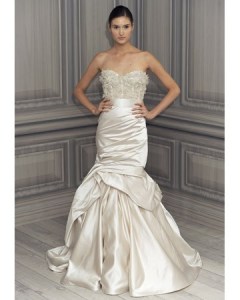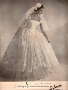 4. Jacqueline Bouvier wore an ivory silk taffeta gown with a portrait neckline and bouffant skirt decorated with interwoven bands of tucking, by Ann Lowe for her 1953 nuptials. You laugh, but embellished skirts are a huge trend and I BARELY resisted. Alyne’s “Wendy” gown was a serious contender. Eek!