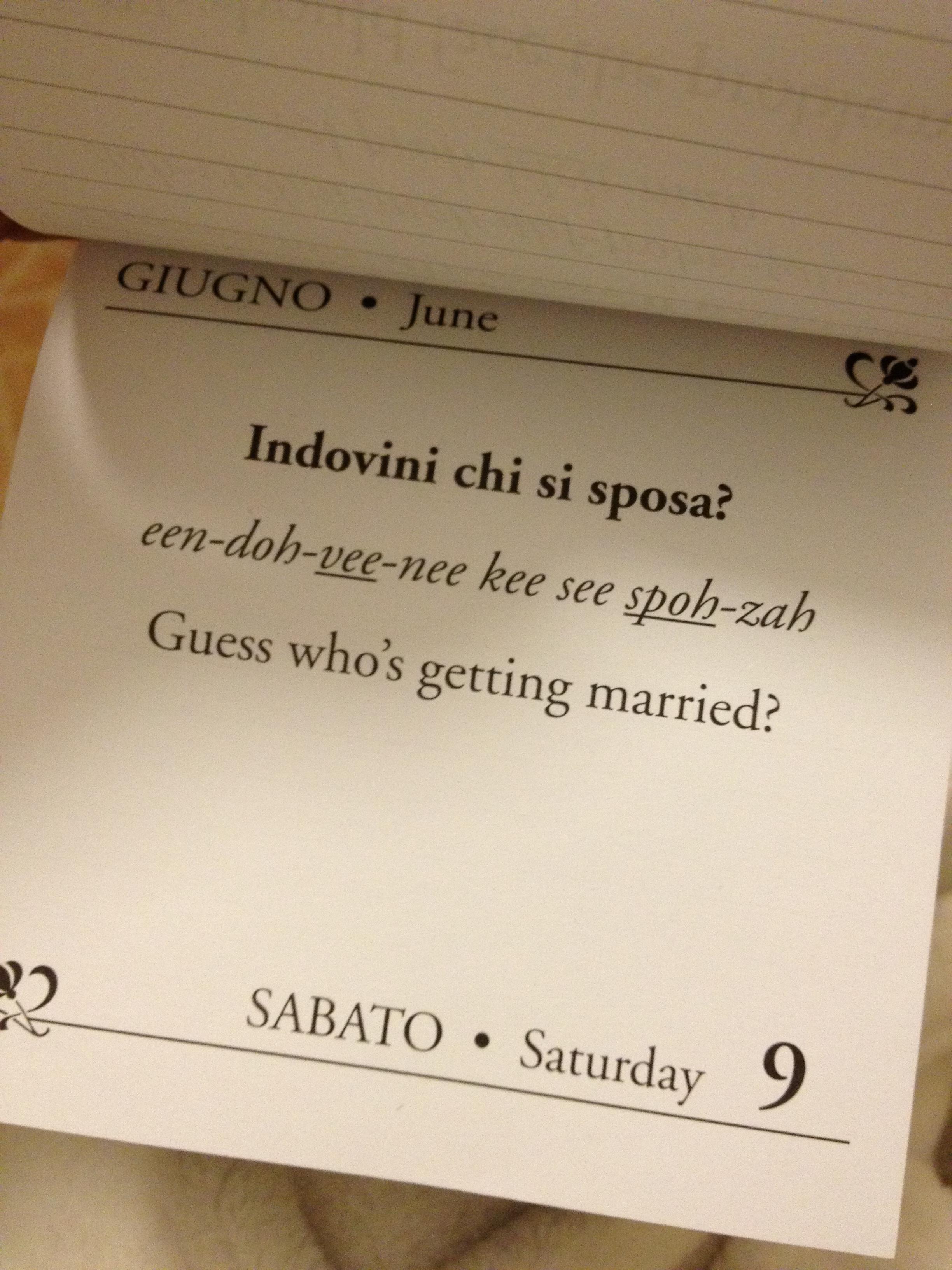 I was flipping through our 2012 Italian “word-a-day” calendar and thought: “Wouldn’t it be totally crazy if there was something wedding-related on our wedding date, June 9th? Look what I found…