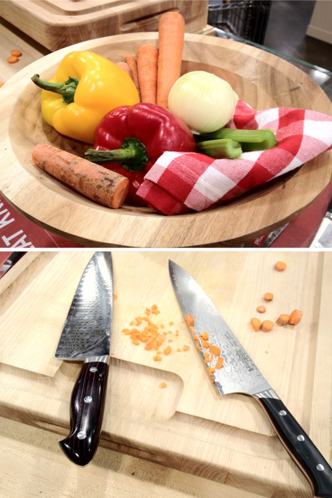 After a fabulous brunch, she taught us all about knives. We even got a bowl of veggies to try the knives with. While Brian bee-lined for the Santuko knives (a multi-purpose Japanese chef’s knife) I had my eye on something a little more traditional. I wanted a french knife.