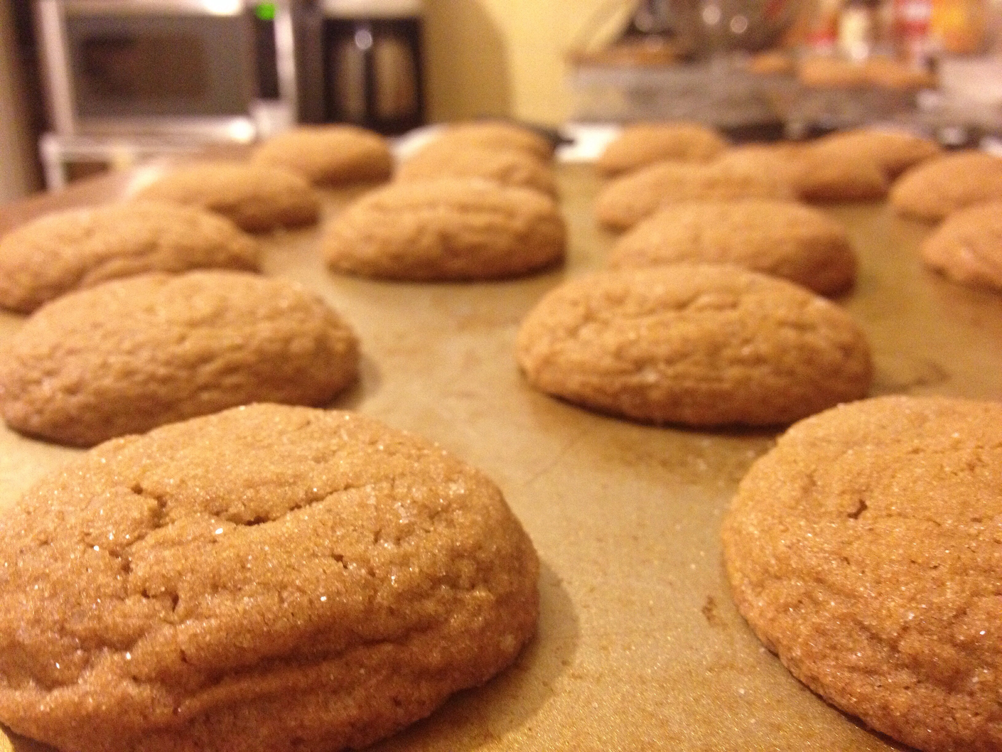 Near-perfection. We’ve been exhaustively researching recipes for a soft gingersnap cookie to add to our Christmas cookie repertoire but I saved this promising one for today. When you can’t stop from eating fragrant hunks of raw dough you’ve found a keeper. The only changes I made were swapping the margarine for unsalted butter (for a less “flat” cookie), not flattening them at all before baking, and undercooking them just slightly so they had slightly crispy bottoms but softy, chewy insides. Next time I’ll add a bit more nutmeg and some fresh grated ginger for more kick. We agreed they were totally delicious as is, but we want to achieve the perfect soft ginger cookie and we’re just not there yet!
