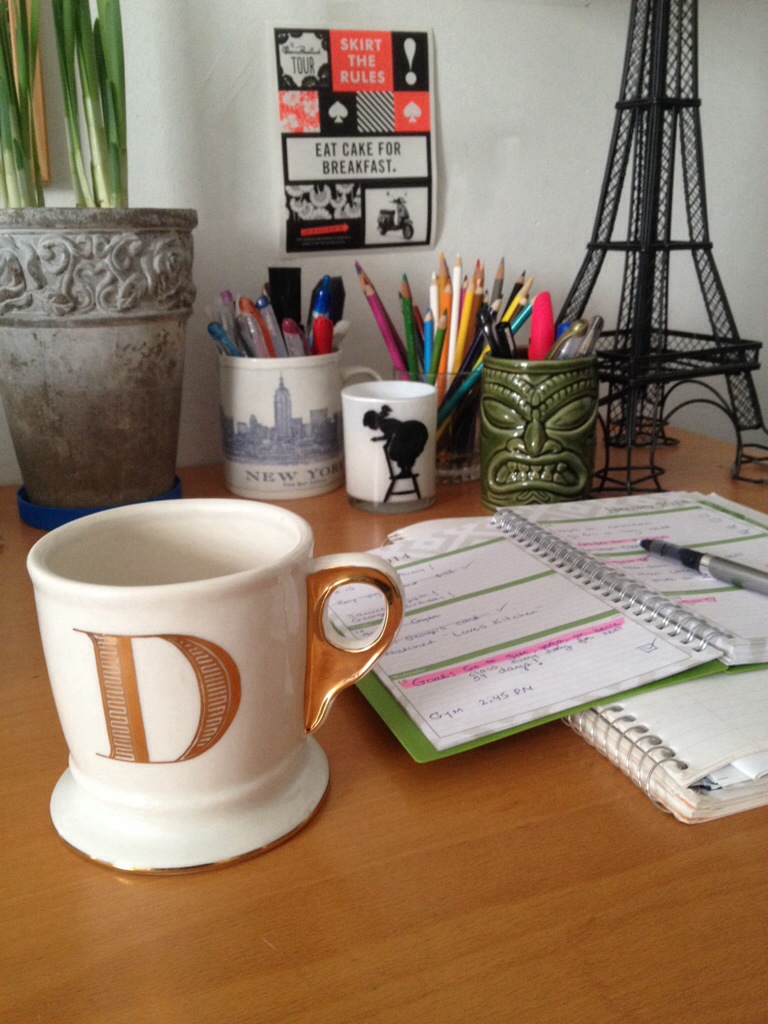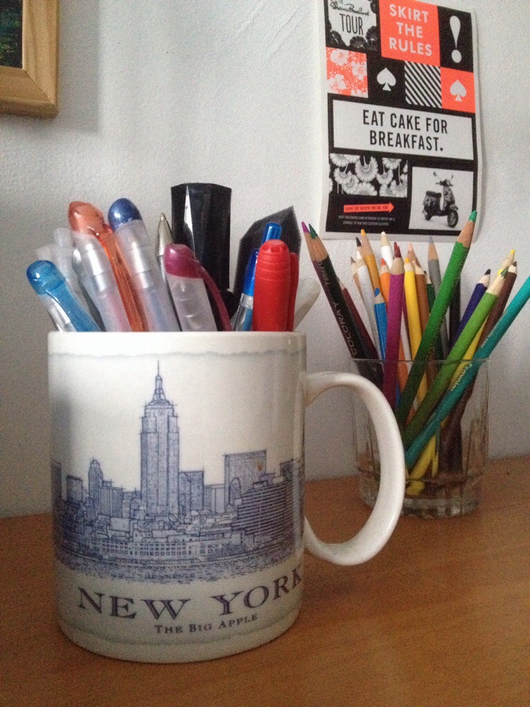 I’ve started to re-purpose a few of them in the office to wrangle my endless supply of sharpies, highlighters, and gel pens and use a few others, like the photo mug my friend Lauren made me years ago that I treasure (but is too scandalous to share here, unfortunately), to store makeup brushes and eye liner. I bought this “Big Apple” mug at Starbucks the night Brian proposed to me in NYC in 2010. It’s one of my all-time favorites as a result so I was heartbroken when I broke its handle recently while washing it. Brian sweetly super-glued it back on, but it’s out of commission as far as “usable drinkware” goes. I love to see it on my desk everyday though as a reminder of one of the happiest days of my life.