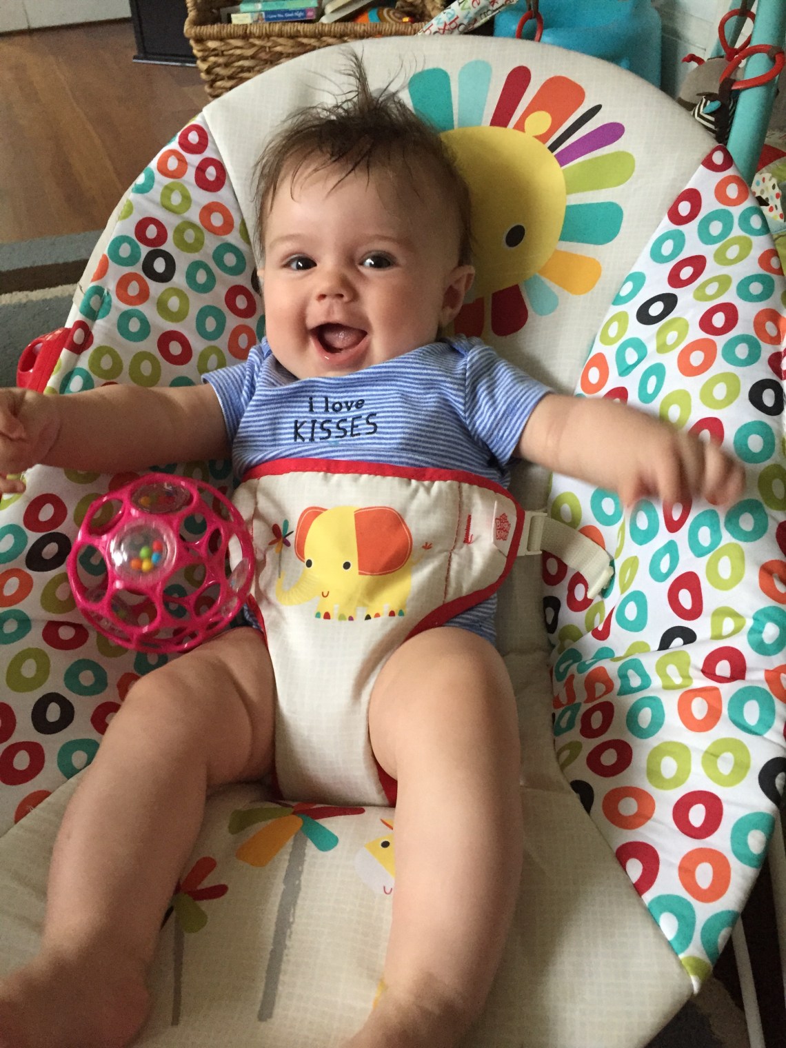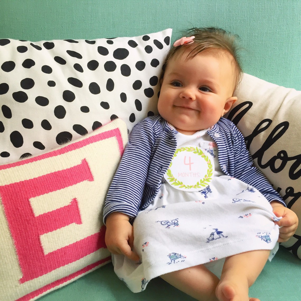 This little love is 4 months old today. She weighs 13 lbs, 13 oz and is 25 1/4 inches long — 77th percentile for height. She continues to “talk” to us 24/7 and absolutely adores music; we’re constantly singing to her. I love her sweet little voice! I think it’s such a pleasure to see her smile because she looks quite serious a lot of the time, but will spontaneously break out into this enormous, dimpled smile that just makes me melt. In the last month, I’ve even been able to get her to giggle by kissing under her chin, near her neck. It’s the sweetest little sound, hearing her laughing but it’s not easy to get to her neck under her little double chin! Also, if I laugh at something she’s doing, she‘ll try to imitate the sound I make, but at a half speed, “ha…ha…ha.” It’s absolutely adorable.