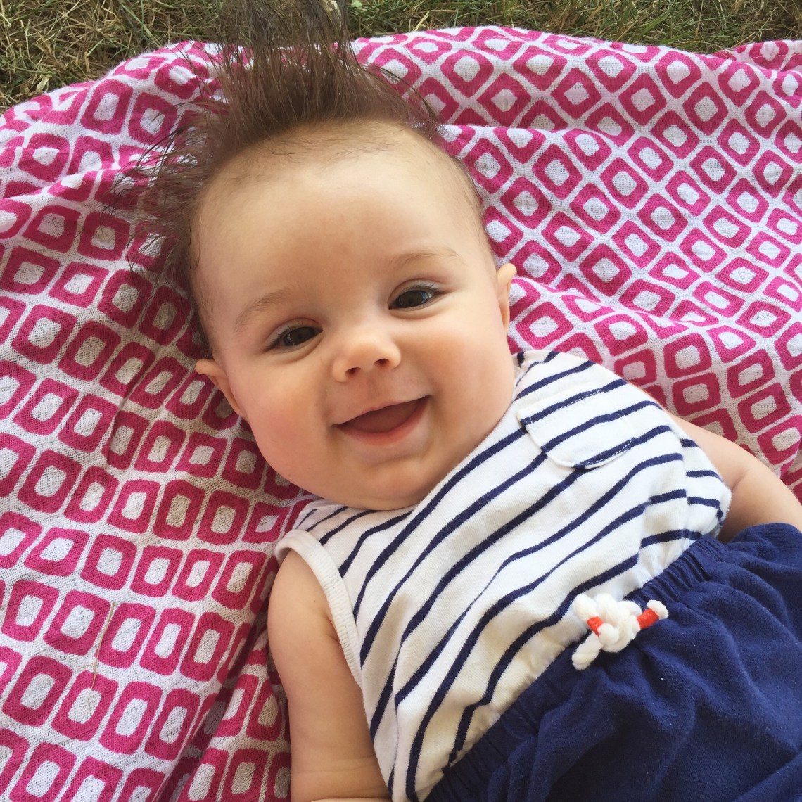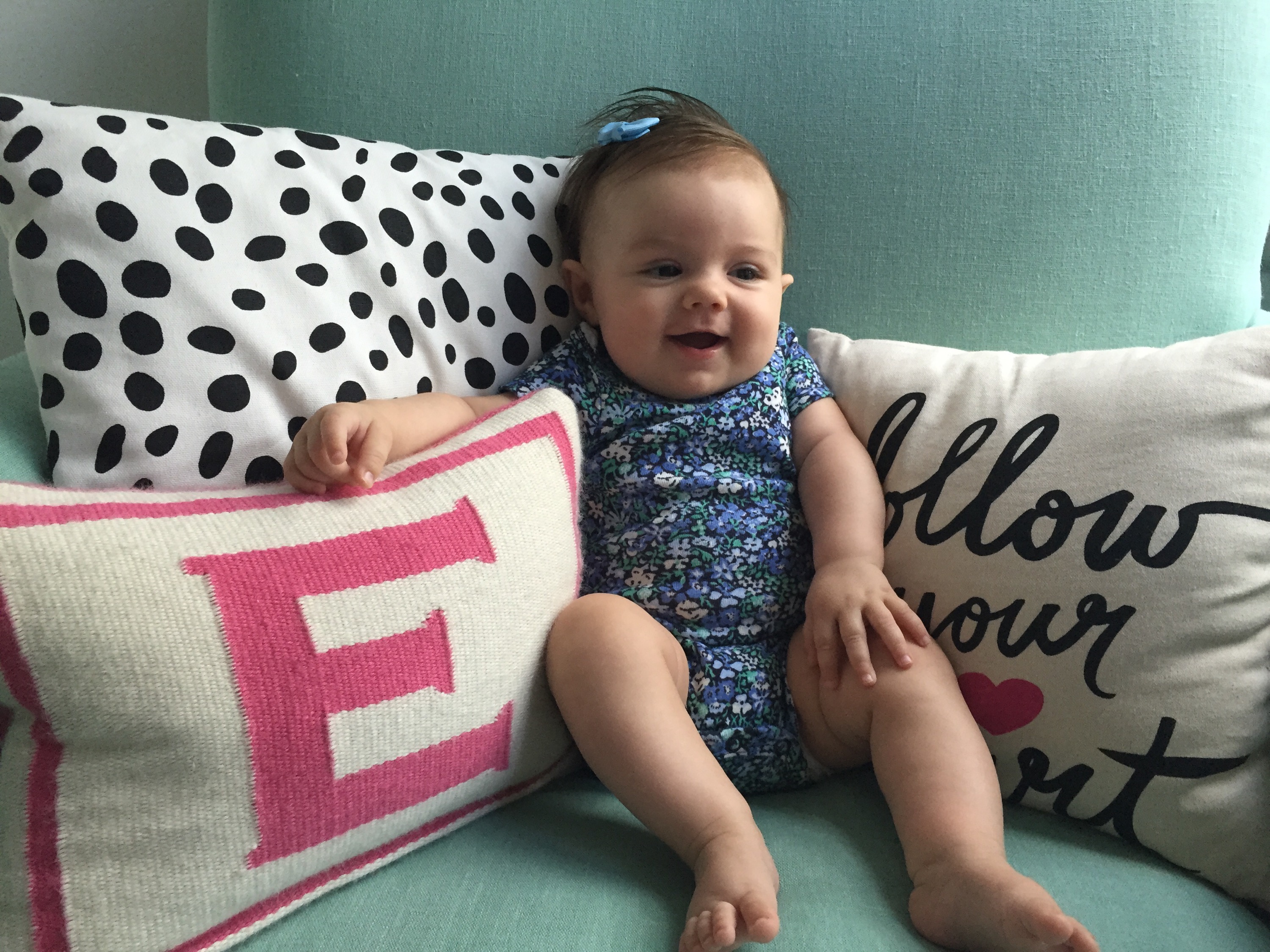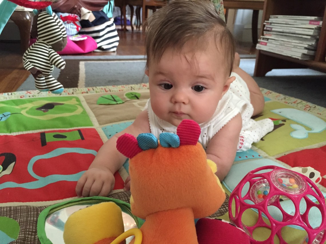 This little love is 4 months old today. She weighs 13 lbs, 13 oz and is 25 1/4 inches long — 77th percentile for height. She continues to “talk” to us 24/7 and absolutely adores music; we’re constantly singing to her. I love her sweet little voice! I think it’s such a pleasure to see her smile because she looks quite serious a lot of the time, but will spontaneously break out into this enormous, dimpled smile that just makes me melt. In the last month, I’ve even been able to get her to giggle by kissing under her chin, near her neck. It’s the sweetest little sound, hearing her laughing but it’s not easy to get to her neck under her little double chin! Also, if I laugh at something she’s doing, she‘ll try to imitate the sound I make, but at a half speed, “ha…ha…ha.” It’s absolutely adorable.