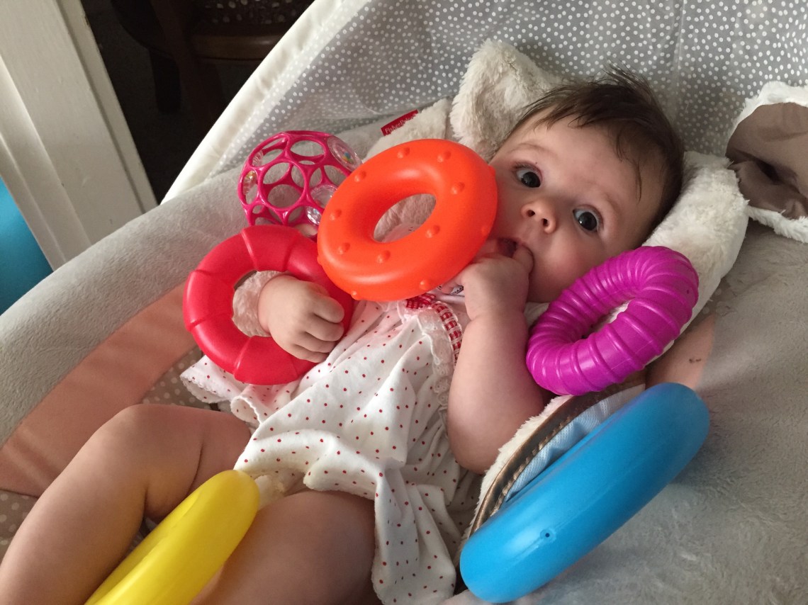 Her hand/eye coordination is incredible, too. For weeks now, I’ve been giving her various teeters to hold and she’s finally getting the hang of one in particular — it’s a lightweight, blue ring with indented textures for gripping and a little palatte-shaped, toothbrush thing that she loves to gum. Last week, I hung some linking rings off her swing mobile and watched as she eyed them and then swiftly, deftly grabbed one in each hand. Her little elbows locked and she reminded me of a gymnast working the rings. Just the other day, I crinkled a mini York Peppermint patty in front of her to catch her eye and she took it into her left hand then passed it to her right by pinching with her thumb and forefinger. I couldn’t believe it!